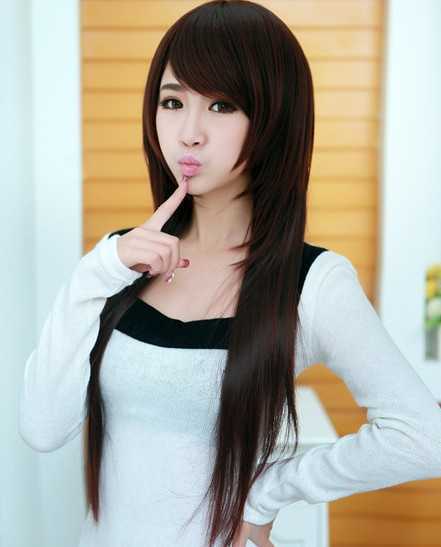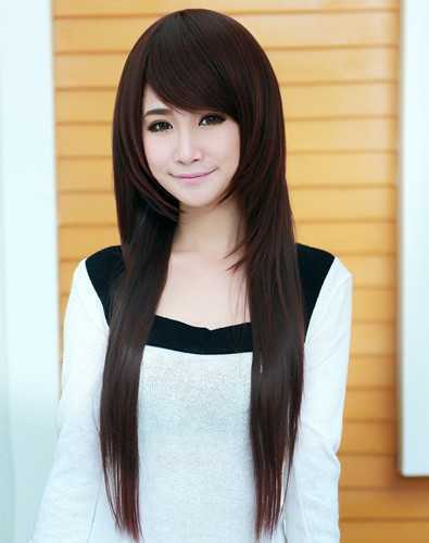 一头柔顺长直发带给人一种飘逸感,斜刘海,两颊有些少内扣的发尾,修脸最佳哦!浅红棕发色更是时尚潮流!