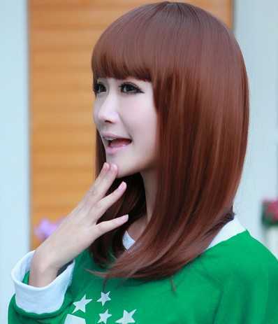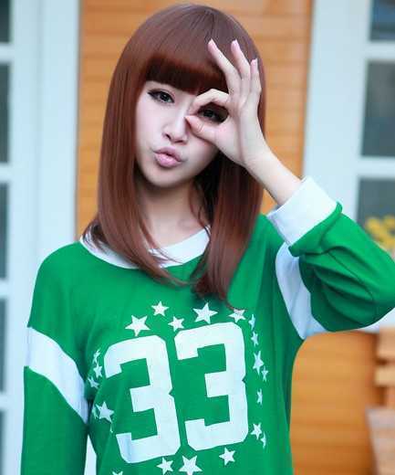 蜜糖棕发色在2013年很为流行,齐刘海设计给人一种甜美感,两颊内翘发尾,彰显出俏皮感,加上卖萌的表情更加可爱哟!