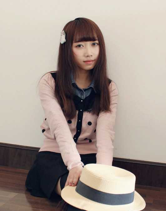 齐刘海的中长发,透着缝隙,散发着清新气息,两颊的头发带着蓬松感,脸蛋瞬间被收小了,搭上帽子,很乖巧的邻家小女生。