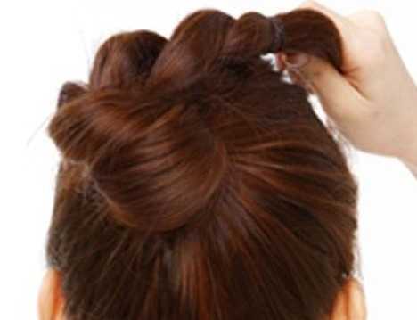 步骤四:编成发辫时就用胶圈绑好,如图所示向上圈绑起来就OK!