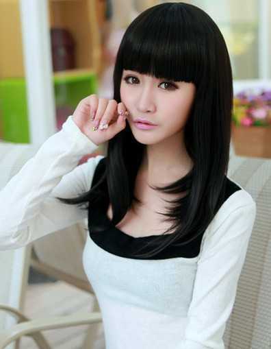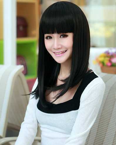一头乌黑柔亮的柔顺直发,呈现出白皙肌肤,剪齐的刘海,最显甜美,内扣发尾,减龄的同时又修脸哦!瘦脸效果很好!