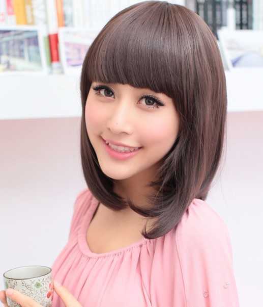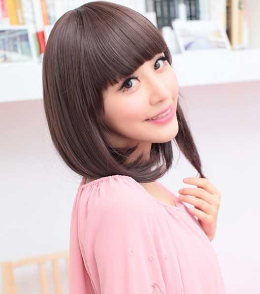 栗棕发色,呈现出白皙美肌,前面是齐刘海,甜美时尚,内扣的发尾,对脸型进行了一个修饰,很有瘦脸效果,减龄又是最棒的!