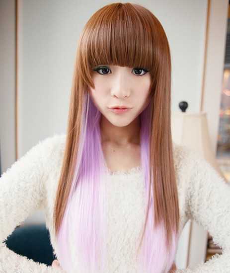 个性、时尚的双色渐变淑女长直发,深棕色和浅紫色组合,够个性潮流吧!两颊有点内扣的短发丝,正好修饰了脸颊,2013最流行,出街赚尽眼球哟!