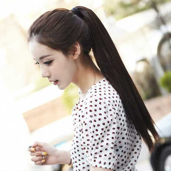 这款女生直发发型是黑色长直发扎发,不仅带出清纯甜美感,而自然可爱气息也逐渐逼近,无刘海搭配突出明亮的双眼,更显精灵可人,淡妆的搭配更是清新动人。