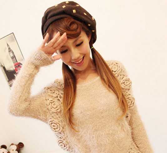 个性弧度形状的刘海带出整个发型的最亮点,清新的双马尾直发扎发,低低扎在耳朵的下方,超甜美的小女生形象就这样简单出来,时尚的帽子配上可爱的手势,俏皮味道浓厚