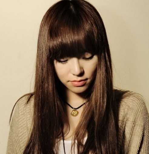 又是一款齐刘海打造的直发发型,甜美乖巧的女生形象有木有?棕色的染发非常的时尚个性,融入在光泽质感的直发丝见,很有美腻感觉。