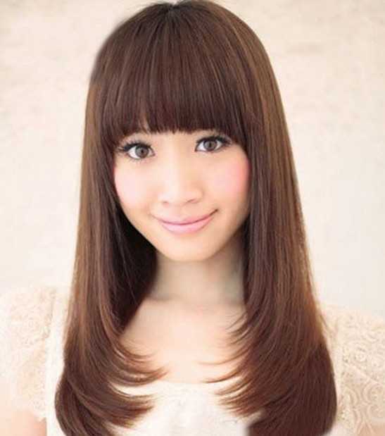 可爱的齐刘海直发梨花头,齐发尾的内扣设计能够完美修饰脸型效果,淡淡的棕黄发色,让整体造型看起来时尚甜美哦!