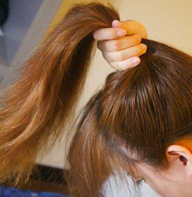 梳好头发后用手抓起头发,一边梳一边把头发扎起来,用橡皮筋把头发扎成一个高马尾。