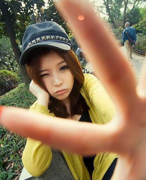 看上去整个非主流感觉,黄棕的发色,发梢略带卷发的味道,斜刘海,看起来很甜美哦,搭上一顶个性的帽子,来一个卖萌的表情,超可爱甜美,非主流感觉十足。