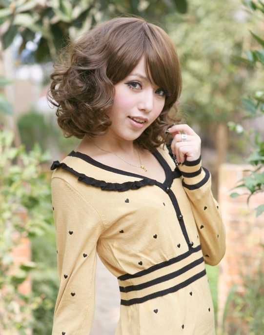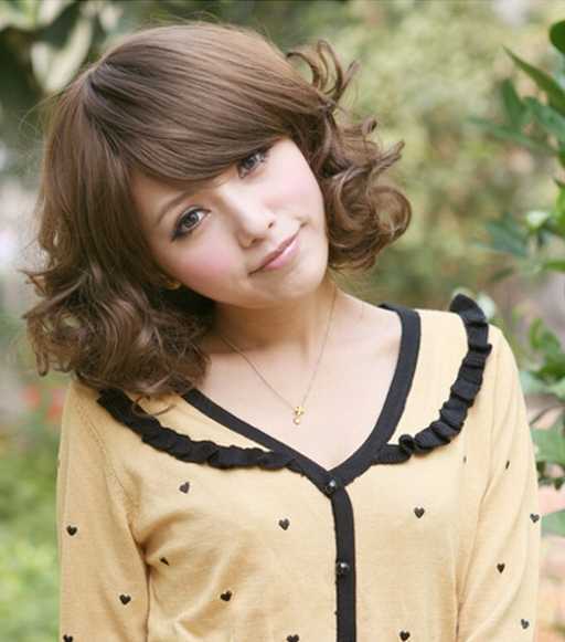斜刘海,甜美哦,两颊蓬松稍显凌乱感的头发,时尚的亚麻棕色,显得俏皮可爱,有点芭比娃娃的感觉,甜甜的微笑,甜美又可爱的一款齐肩蛋卷发。