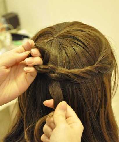 再将马尾往里折,往里穿过马尾,具体步骤如图所示哦,注意不要弄乱咯。