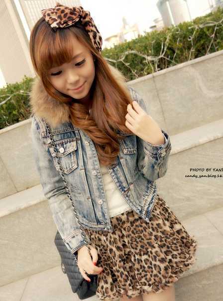 稍斜的刘海,增添了清纯气息,棕色的头发时尚又可将肤色显白,搭上豹纹发饰,个性又可爱,