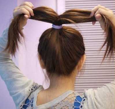 步骤二:将马尾从中间分开,分成两份,如图上面所示。