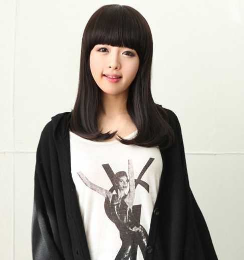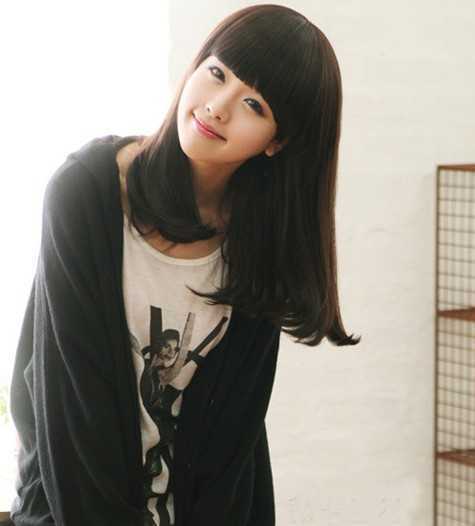一头自然黑的发色最好衬托肤色哦!齐刘海给人甜美感,两颊内翘发尾彰显出俏皮感,还非常的修脸呢!在2013年这款韩式发型也相当流行!