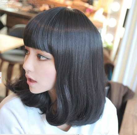 乌黑的秀发,自然清新,平齐刘海,内卷的及肩发梢,蓬松感十足哦!很清纯甜美的一款黑色及肩发型哦!