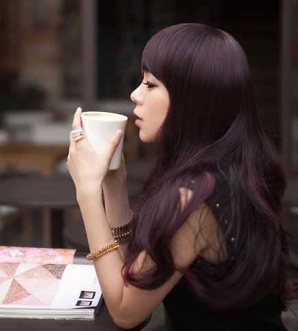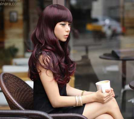 酒红色的发色,给人热情,妖艳气质!齐刘海让人感觉清纯,大卷的发梢,很有女人味哦!