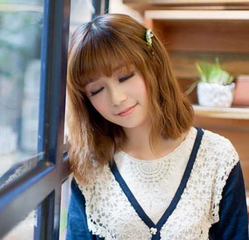 轻薄的齐刘海,闭眼的一个小动作,呈现更多的是唯美安静感,齐肩的长度发型又是优雅不做作,搭配稍微动感的卷发,使这款日系发型透出最亮丽时尚的一面。