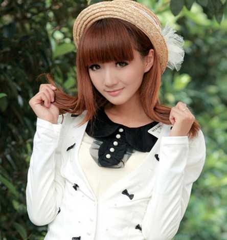 前面是剪齐的刘海,看上去超级甜美的,棕黄的发色,很显潮流,2014年校园女生最爱的发型,往头上戴起的蝴蝶结发饰,更是增添了甜美气息。