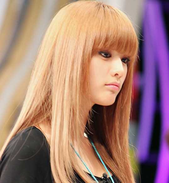 顺直的中长发型,发尾打造少许微卷的设计,令这款发型更显出气质的美态,加上棕黄染发造型后,2014年里更是吸睛迷人了。