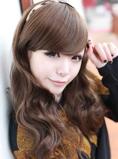甜美、时尚的板栗棕大波浪中长发,好看的斜刘海,卷烫的大波浪随意散落,增添了一种美感,往头上戴起的发箍,更是增添了时尚。