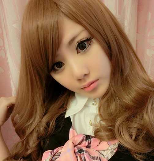 抢眼的棕黄染发,很好将妹子白皙的肌肤衬托,斜开的刘海,很显甜美,大波浪卷烫发丝,修脸效果十分好。