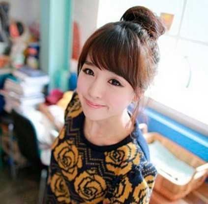 将一头中长的头发高高扎成丸子头,斜开的刘海,好好看,深棕色染发衬托女生白皙肌肤,甜美可人的形象轻松凸显。