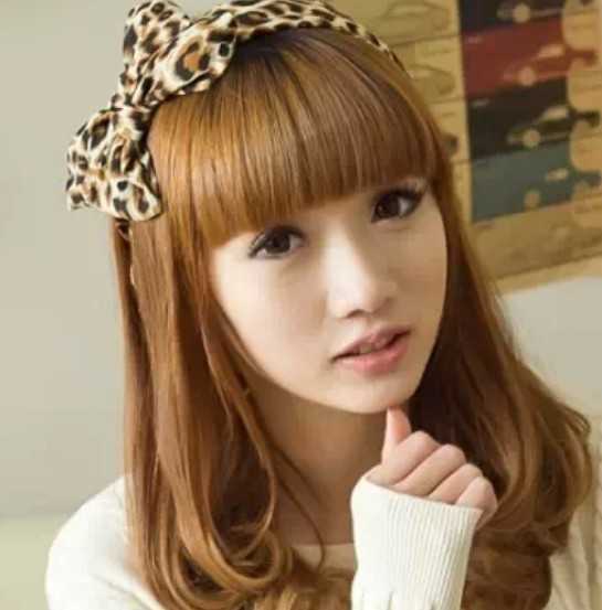 非主流女生大爱的一款日系中长假发发型,淡淡的棕黄染发色就很是时尚了,内扣的梨花烫发尾搭配整齐刘海,修颜更是清纯可爱的完美凸显。