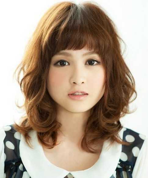 2014气质的一款女生中长烫发发型,不规则卷发束的设计,搭配短短的齐刘海,轻松就能塑造出小脸效果了,即使是不完美的圆脸也变得好看时尚了。