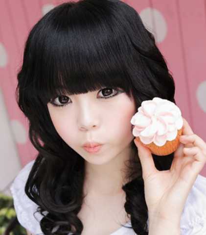 韩范十足的中长卷发,肉嘟嘟的圆脸很显可爱,前面剪齐的刘海,凸显甜美,卷烫的发尾搭在肩上,修颜减龄。