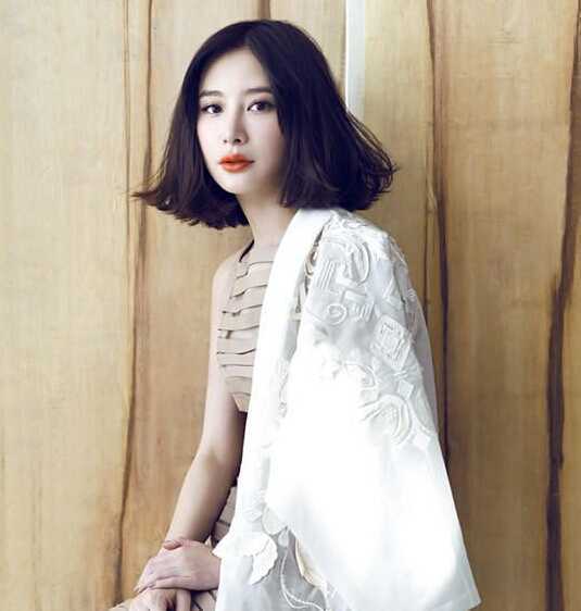 中分荷叶头的齐肩发型,两侧较蓬松的头发有着超瘦脸的效果,纯黑的发色搭配橘色美妆,彰显出优雅气质女神魅力。