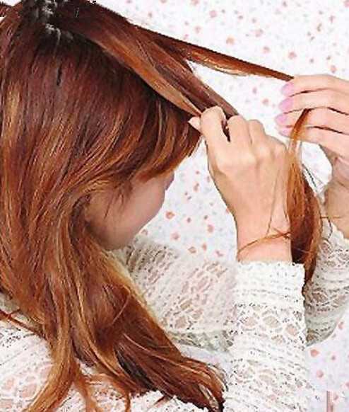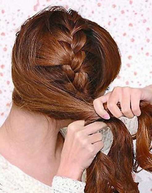 步骤一:从头顶取三股发束,往斜下方拉,编织三股辫。