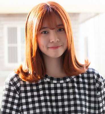 这款外翻卷发采用了时下最热门的韩式空气感刘海,提升灵动气质,发尾打造成俏皮外翻大卷,可爱又吸睛,橘黄的发色时尚耀眼。