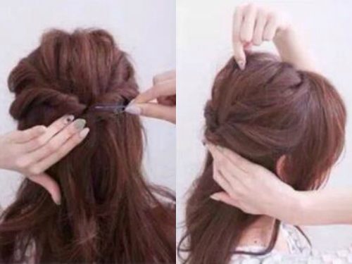 在将发顶两侧的头发变成发辫后,我们要将它们合并在一起,然后使用发夹固定好,最后将发顶与四周的头发拉扯得蓬松一些与打理好刘海就可以了。