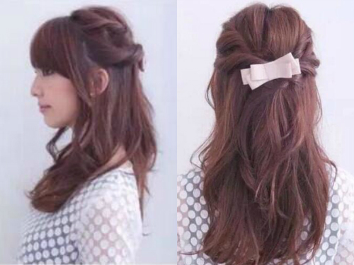 这是一款斜刘海中长发半扎发,它的造型甜美可人,斜刘海有助修饰圆脸女生的脸颊,非常显瘦哦!