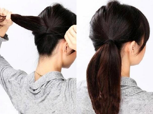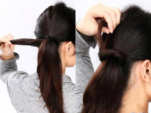 从马尾中拿起一小束头发,略微旋转后缠绕在马尾根部上,让头发遮挡住橡皮筋。将发尾藏在马尾根部内层,如果担心头发会散,可用发夹固定好。