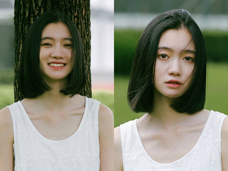 这样简单的一款齐肩直发发型,搭配经典的黑色发色,看起来舒服又自然。乌黑浓密的头发顺直下垂,利落又整洁,发尾修剪平齐并向内弯,可以裹住肉肉的脸颊,无刘海的设计露出额头倍添清爽感,不管笑与不笑,都显得纯美动人。