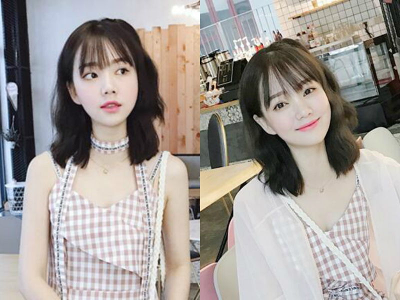 一款可爱的女生齐肩发型,隐约有些弯曲弧度的黑色发丝,顺着脸颊滑落俏丽可人,柔顺的空气刘海长至眉毛,展露出女生精致立体的五官,真心减龄显嫩,加上刚好贴肩的发尾长度衬托出细长的脖子,下巴看起来更尖,怎么看都是甜美女神范呢。