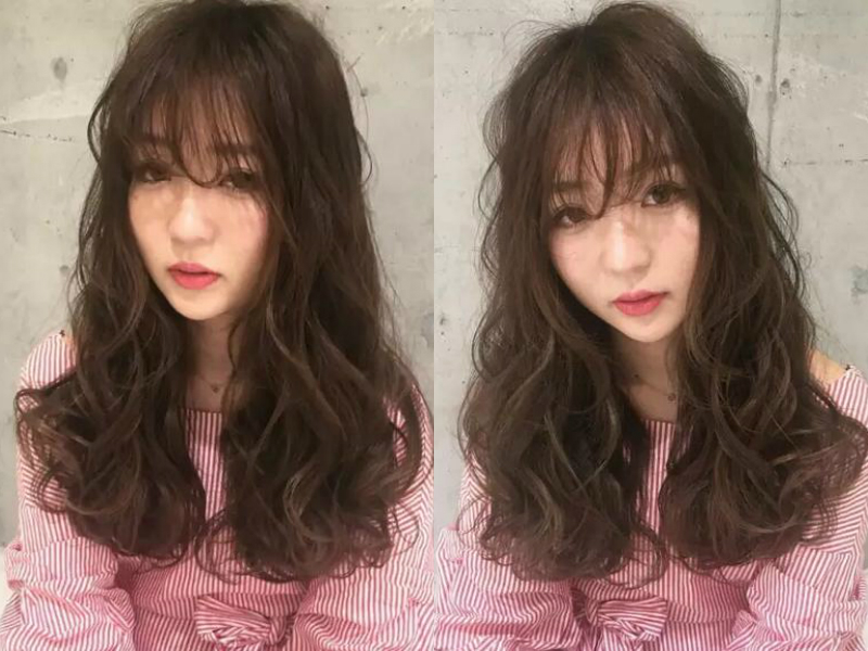 这款凌乱卷中长发发型带有一些朦胧感,其打造的重点就在于利用大波浪卷的弧度使发型呈现空气感,脸颊两侧自然内卷的发丝配上长至眼睛的空气刘海,起到非常不错的修饰脸型功效,再加上流行的深棕色染发搭配,整体发型看上去凌乱中带点小性感。
