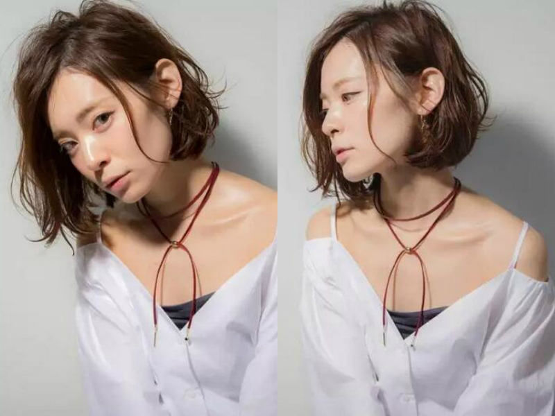 这款齐肩发型整体造型偏向慵懒的风范,二八侧分的刘海为瘦脸耍了小心机,斜遮住侧边脸,另一侧头发夹至耳后又偏偏留出一缕发丝贴着脸颊,更显得脸型完美,有点散乱的发丝好像是用手随便轻抓出来的,显得非常自然。