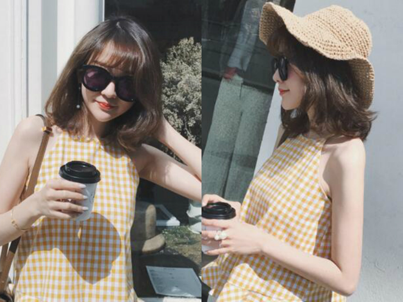这本是一款甜美的刘海齐肩发型,经过染烫使头发呈现出蓬松感,增添了一丝随性的味道。及眉的刘海贴着额头微微侧弯,遮住额头只露出脸蛋下部分,加上发尾贴着脸颊稍微内扣,一张精致的瓜子脸便不经意展现出来,浅棕色的染发更为发型的时尚度加分,戴上墨镜和大草帽,这是要化身时髦女郎的节奏吗?