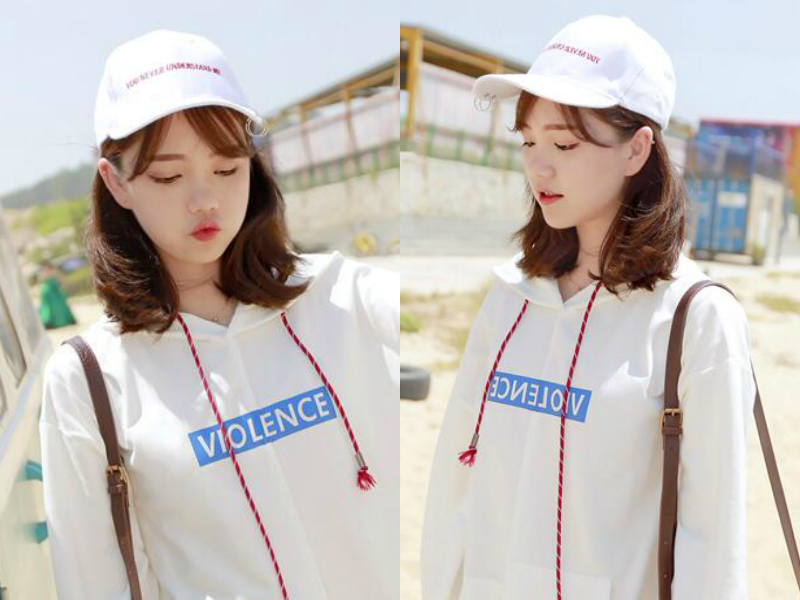 妹子一头及肩发经过卷染之后发尾变得蓬松很多,隐约呈一个“C”字型往中间收拢,显得很独特,加上两侧头发夹至耳后露出脸蛋,不经意间就突出了女生小巧的下巴,刘海以三七分的设计微斜着拨开,戴上一顶白色棒球帽,看起青春活力感十足。