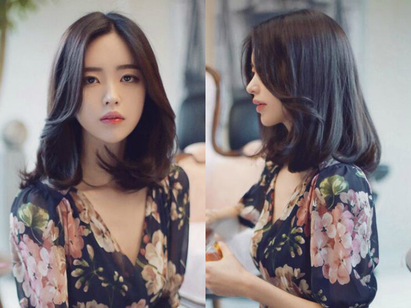 纯黑的发色自然纯粹,把及肩的发尾卷成内扣状,卷翘的发尾看起来灵动轻盈,四六分的刘海轻轻贴着太阳穴垂在两边,露出的中间部分额头更突出女生精致的五官,搭配碎花深V领雪纺衫时尚得来又凸显出女生优雅高贵的一面。