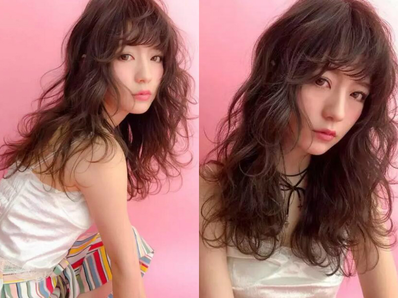 女生一头中长发经过卷烫处理变得十分蓬松,头发上一圈一圈卷曲的形状清晰可见,不经意就为发型带来一丝迷离美,微斜的刘海垂在额前很服帖,挡住额头更突出女生精致的五官。