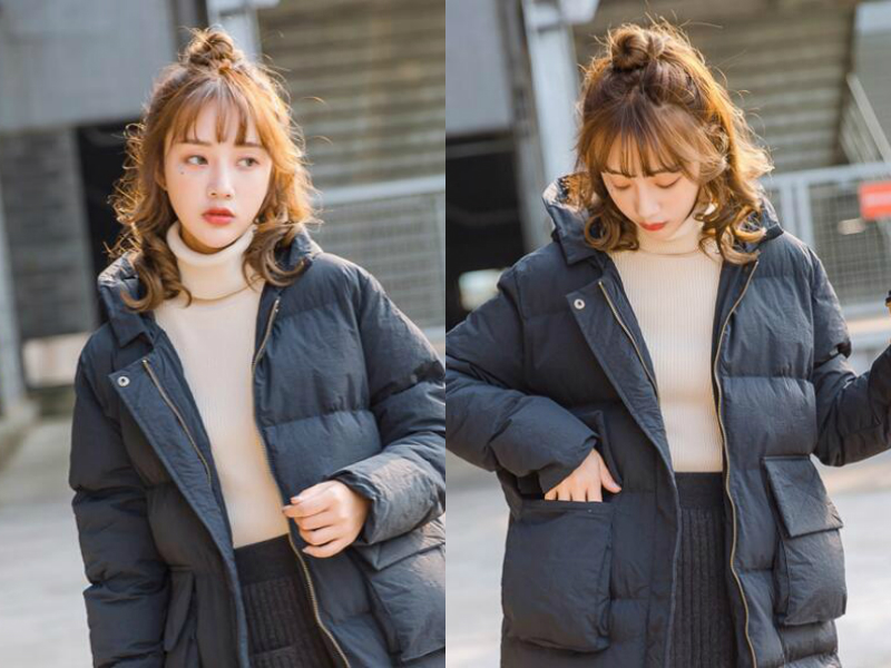 金黄色的发丝在阳光的照耀下仿佛透着光,看起来异常闪耀迷人。轻薄的刘海服帖的垂在额前,遮住额头突出妹子精致的五官,一头卷烫过的头发充满曲线感,弯弯曲曲的滑落在锁骨上,再在头顶上绑一个半扎小丸子头,瞬间增添活泼俏皮的气息。