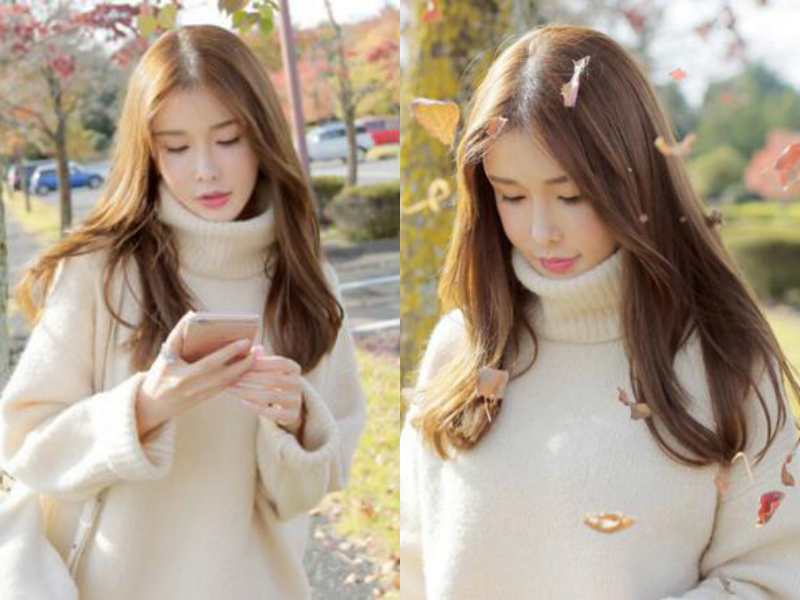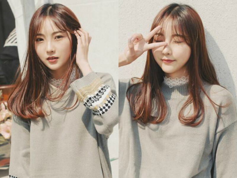 女生发尾带点内扣的温柔系中长发发型,很有飘逸灵动感,薄薄的刘海斜斜分开,露出小巧的脸蛋,温暖的蜜糖棕色在阳光照耀下闪着柔和的光,让女生举手投足间充满温柔又优雅的气质。
