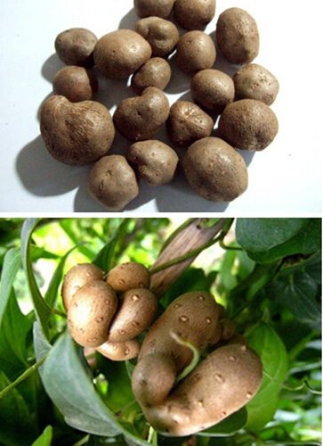 山药植物的叶腋间常生有肾形或卵圆形的珠芽,即山药蔓上结的珠状芽,叶上生,长圆不一;皮黄色,煮熟后变灰色,皮薄,肉白质细,俗称“山药豆”。山药豆特别利于人体消化吸收,健脾养胃,治疗腹泻山药豆汁液柔润,擅补脾胃气阴,能固涩下焦气血。