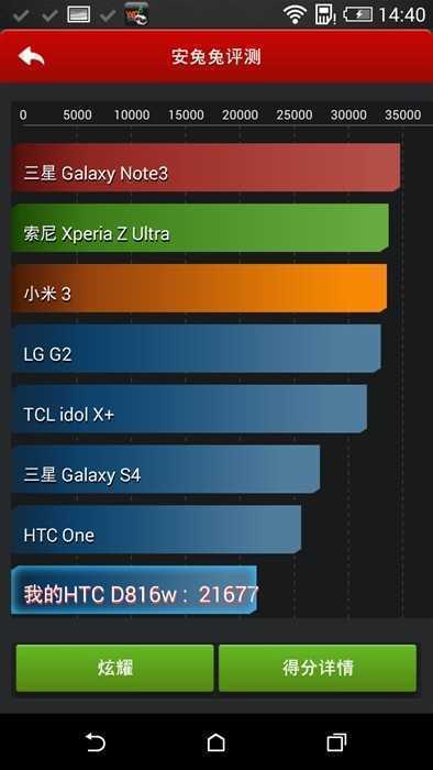 HTC Desire 816采用高通MSM8226四核处理器,主频达到1.6GHz,整体性能表现出色,安兔兔跑分达到21677分,相比那些搭载MTK6589T处理器的机型,具有较大的优势。