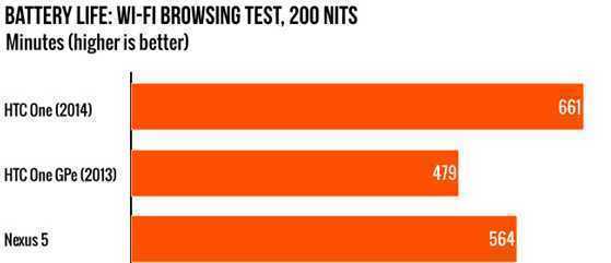 续航方面,HTC One M8配备了一块2600mAh电池,对比Nexus 5的2300mAh电池有着细微但明显的提升,M8多出来的电池容量可以带来大约1.5小时的额外使用时间。