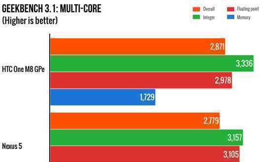 HTC One M8所配备的骁龙801比Nexus 5的骁龙800要更快一些,但程度并不大,对比骁龙800,801在CPU、GPU和内存总线的时钟速度上有所提升,但两款芯片的架构是相同的,骁龙801对比800最明显的提升是在图形性能上面,但幅度依然不大,跑分测试中M8在图形性能上速度提升了28%。