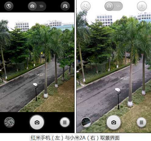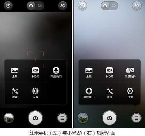 从取景图可以看出,红米手机没有像小米2A一样支持全屏取景,操作面积更直接,从功能界面对比发现,红米手机没有夜景防抖功能,夜间拍摄没有小米2A好用。
